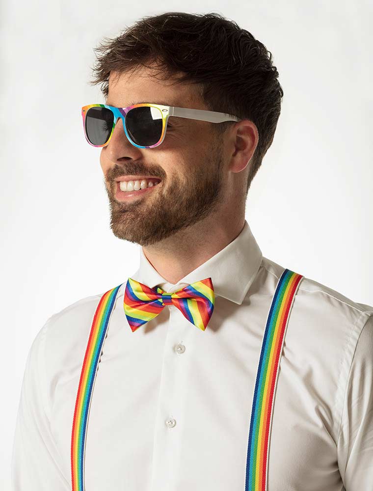 Een vrolijke set bomvol rainbow accessoires om een outfit Pride ready te maken. De regenboog set bestaat uit een partybril met donkere glazen, bretels en een vlinderstrik. Erg leuk om op een simpele manier extra kleur te geven aan een feestelijke outfit.