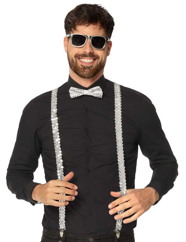 Deze accessoireset zilver bestaat uit een partybril, vlinderstrik en bretels. Een mooie set om je outfit compleet te maken voor een fout feestje, party of Caranaval.
