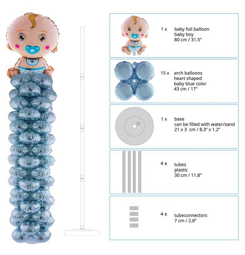 Deze Ballonnenpilaar Baby Boy Met 16 Folieballonnen in de kleur licht blauw is makkelijk zelf in elkaar te zetten en een echte eyecatcher voor een fantastische babyshower.