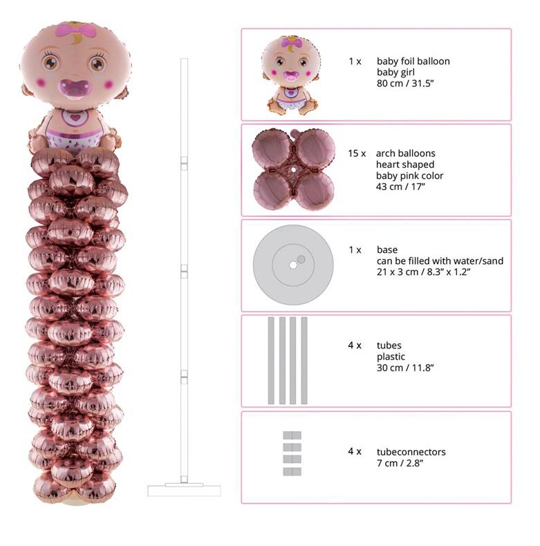 Deze Ballonnenpilaar Baby Girl Met 16 Folieballonnen in de kleur licht roze is makkelijk zelf in elkaar te zetten en een echte eyecatcher voor een fantastische babyshower.
