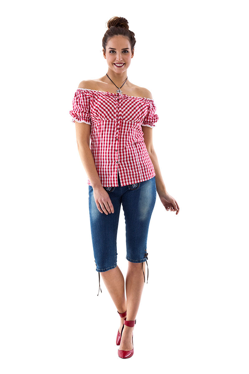 Licht, speels en onweerstaanbaar vrouwelijk – de Carmenblouse rood/wit geruit van Haus Huberts is een frisse klassieker met een zuiders accent. Met haar open schouders en klassieke Alpenruit is dit dé blouse voor zonnige feesten, lange dansavonden en zwoele zomerdagen in trachtenstijl.