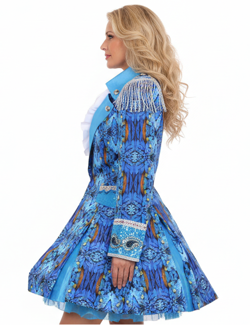 Een mooie carnavalsjas met blauw/zilver patroon. De jas is op de schouders en mouwen afgewerkt met prachtige details.