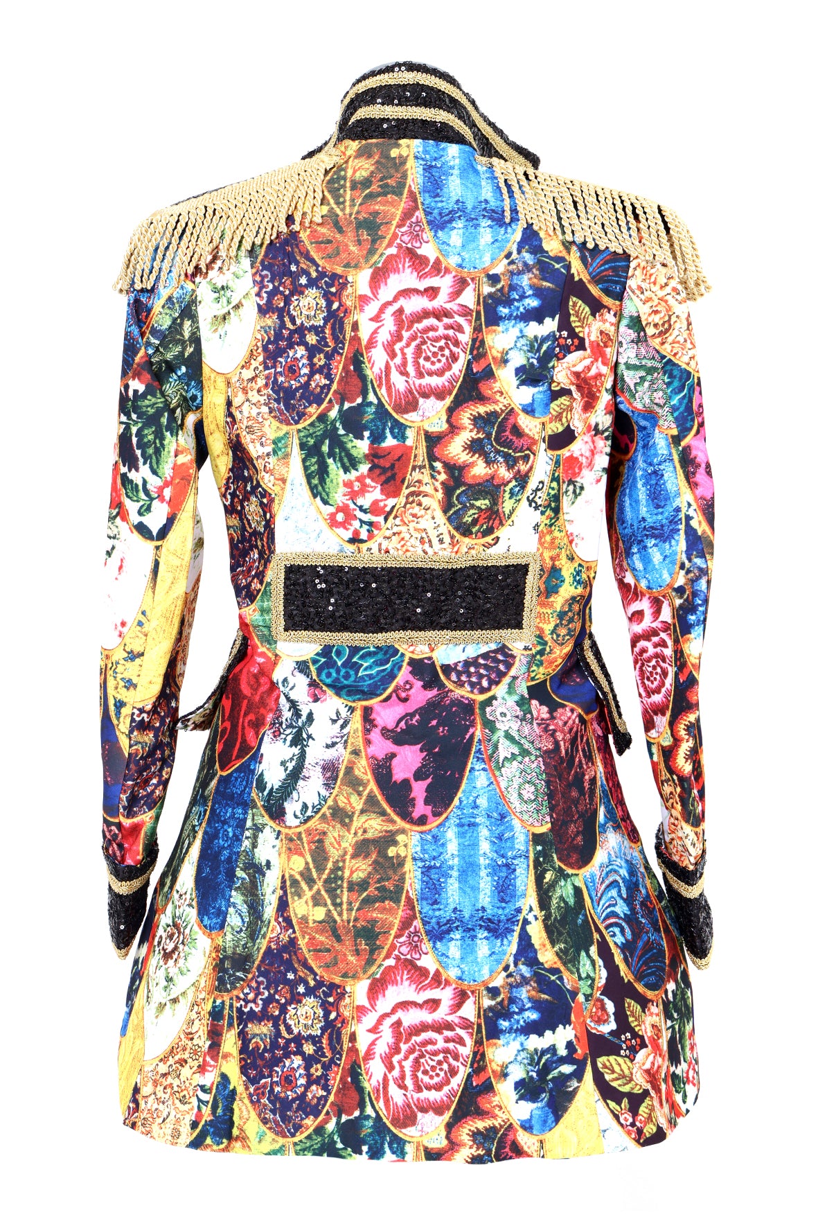 Een mooie carnavalsjas met gekleurde accenten. De jas is op de schouders afgewerkt met prachtige details.