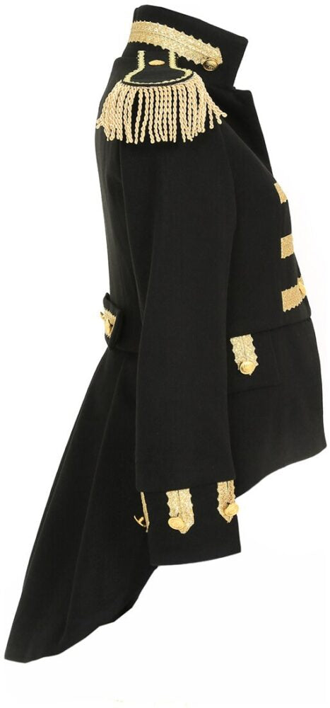 Een mooie luxe zwarte carnavalsjas voor dames afgewerkt met gouden details op schouders, zakken en mouwen.
