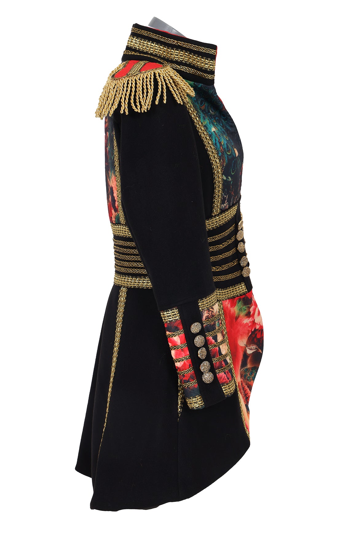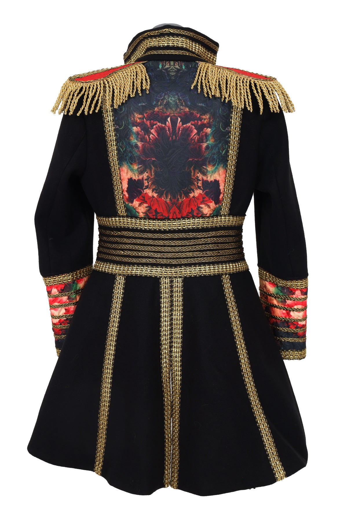 Een mooie carnavalsjas dames in zwart met bloemen en pauwenveren. De jas is op de schouders en mouwen afgewerkt met prachtige details.