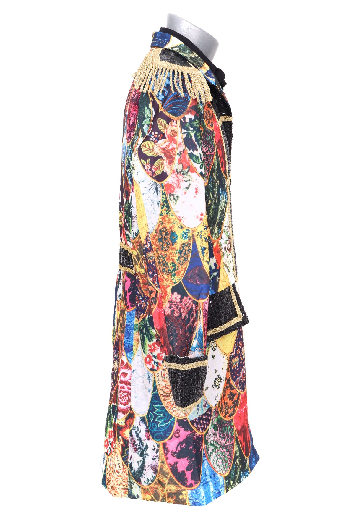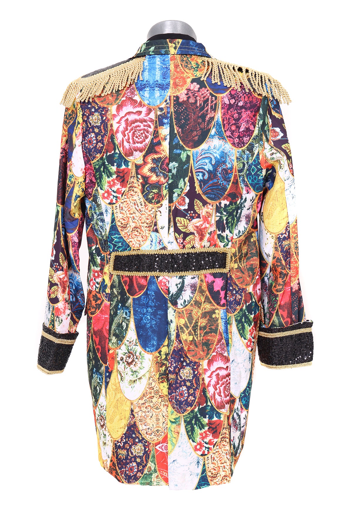 Een mooie carnavalsjas met gekleurde accenten. De jas is op de schouders afgewerkt met prachtige details.