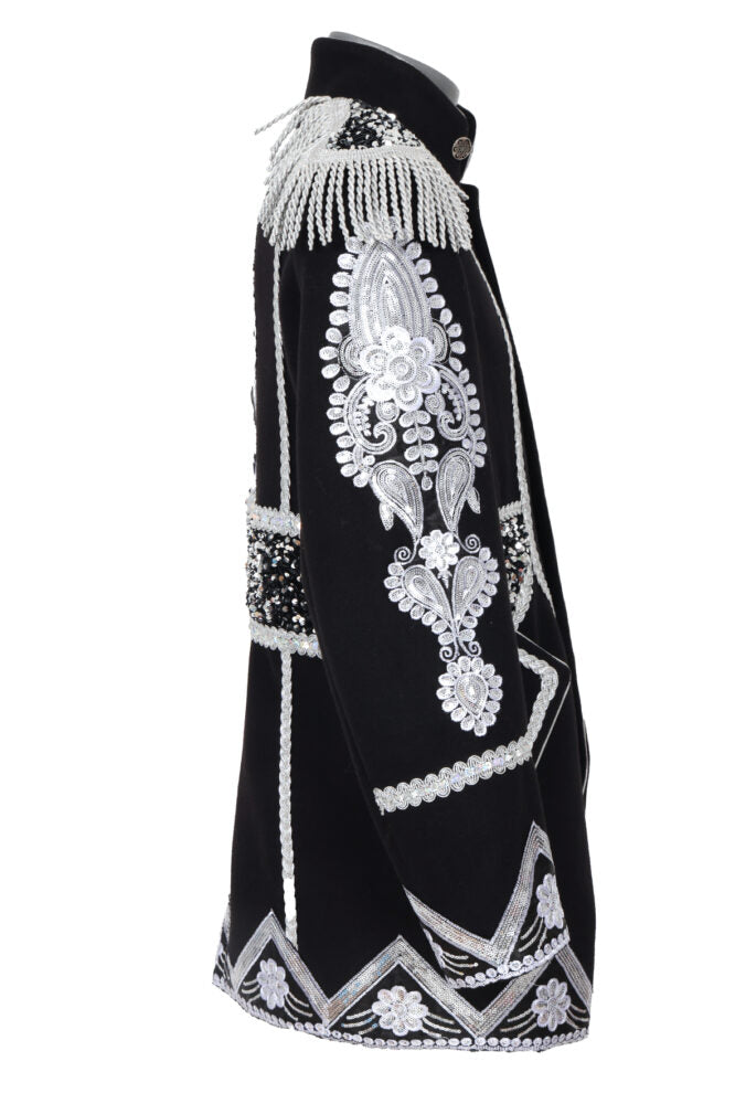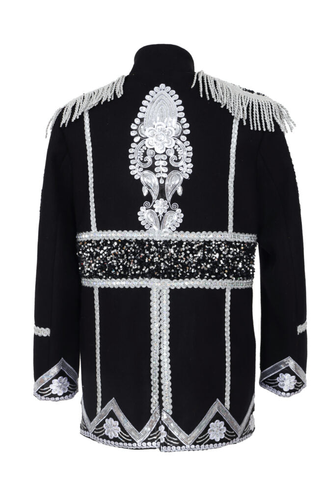 Een mooie Carnavalsjas Heren Zilver deluxe. De jas is op de schouders , aan de voor- en achterzijde en op mouwen afgewerkt met prachtige details.