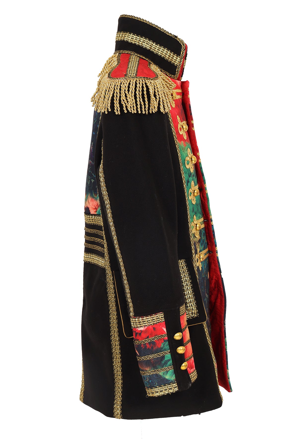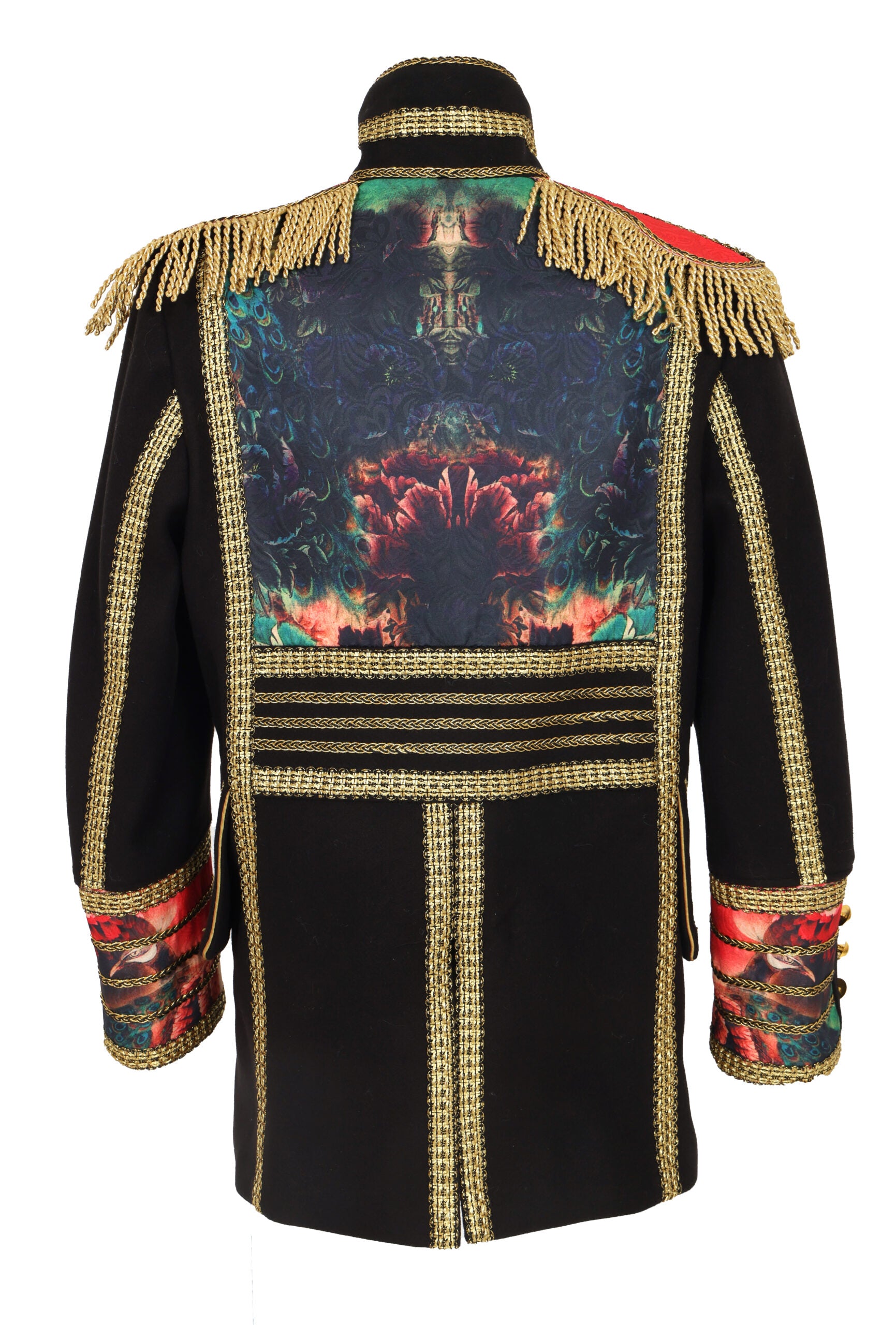Carnavalsjas Heren zwart met bloemen en pauwenveren. De jas is op de schouders en mouwen afgewerkt met prachtige details.
