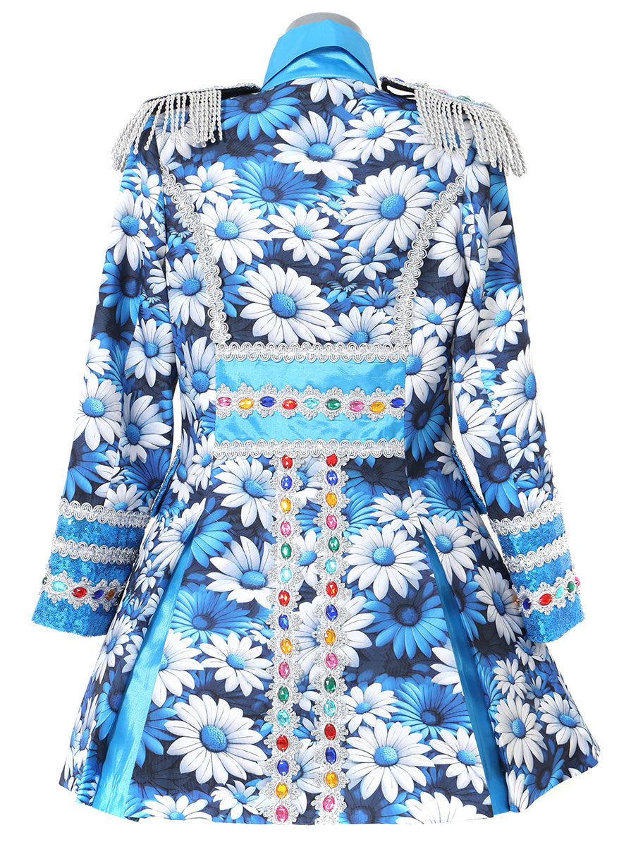 Een mooie Madelief carnavalsjas in het blauw voor dames. De blauwe jas is op de schouders, voor- en achterkant en op de mouwen afgewerkt met prachtige zilveren details.