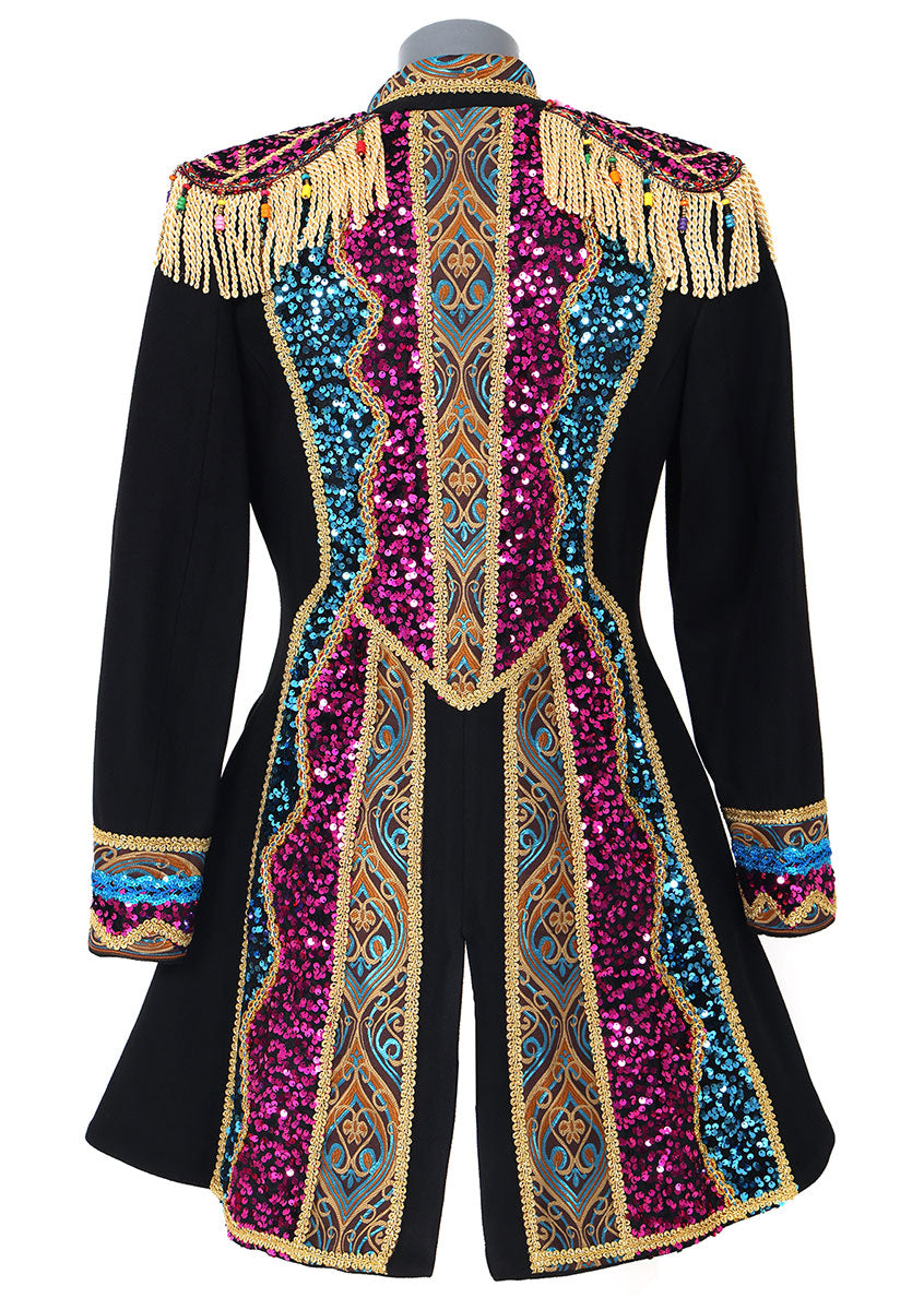 Een mooie pinkblue carnavalsjas voor dames. De kleurrijke jas is op de schouders, voor- en achterkant en op de mouwen afgewerkt met prachtige details.