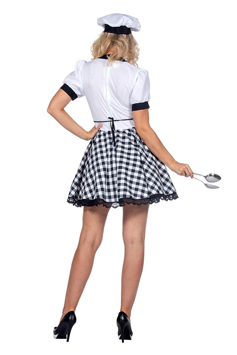 Dit kostuum bestaat uit een Jurk en muts, maar wordt zonder andere afgebeelde accesoires geleverd.