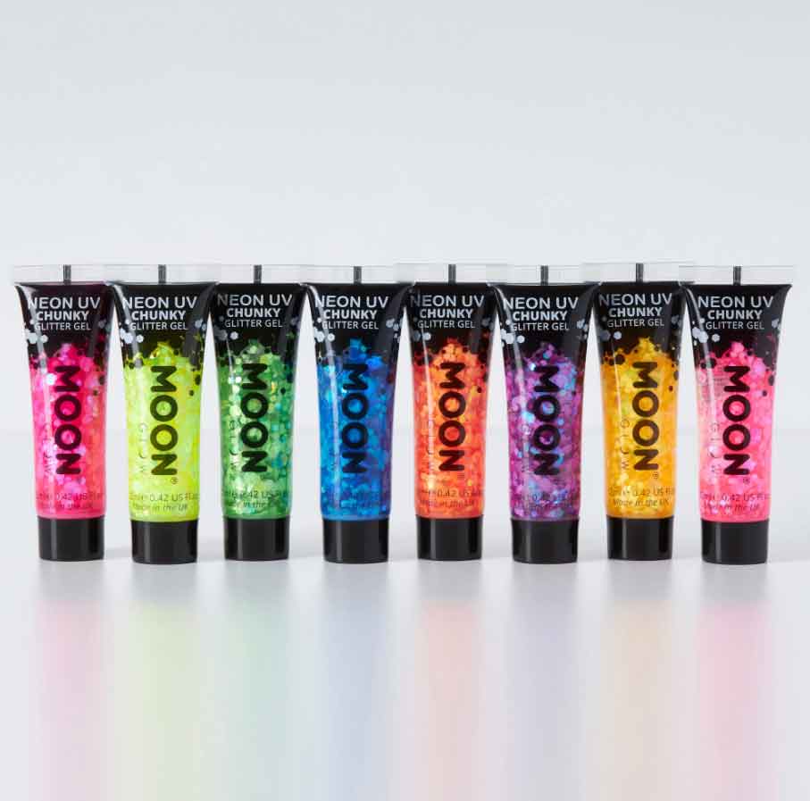 De Chunky Glitter Face en Body Gel Neon UV van Moon Creations kun je op huid en in het haar gebruiken. In deze Chunky Glitter Neon UV set zitten 3 kleuren grove glitters in gel die oplichten in Blacklight licht.