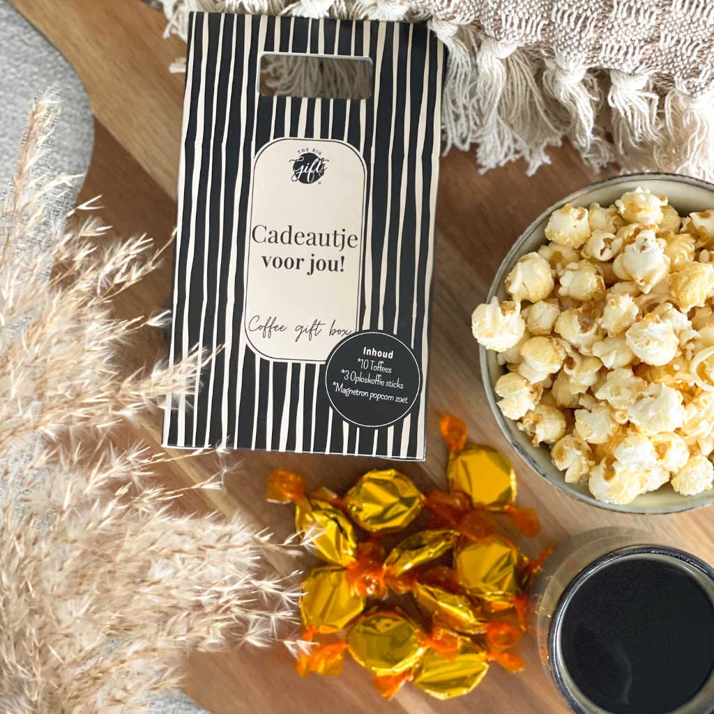 Inhoud: 3 koffie sticks, 10 toffees en 1 zakje magnetron popcorn