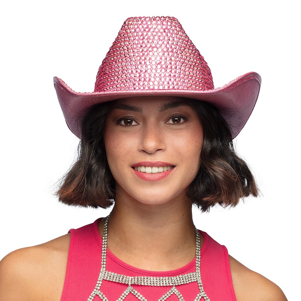 Deze glamoureuze cowboyhoed voegt een vleugje western flair toe aan elke festivaloutfit. De hoed is versierd met glimmende roze steentjes voor genoeg glitter om feestgangers te laten stralen in de menigte.