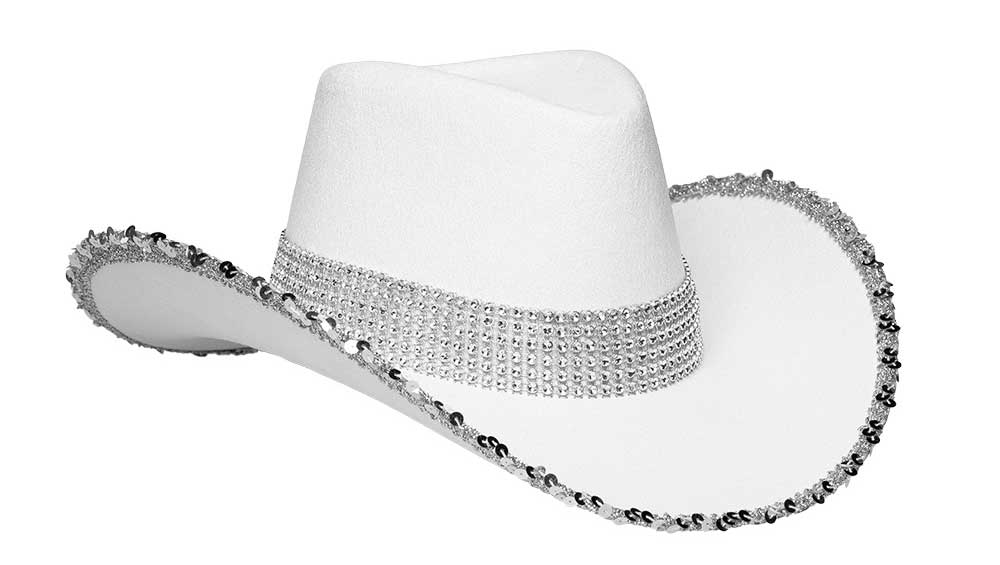 De Cowboy Hoed Girls Party is een stoere witte cowboyhoed met glimmende volop zilveren en witte studs.