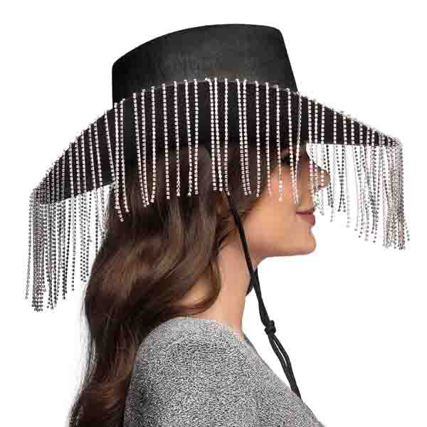 Deze mooie Showgirl cowboy hoed heeft een band met steentjes en glamoureuze slierten voor een mysterieus effect.
