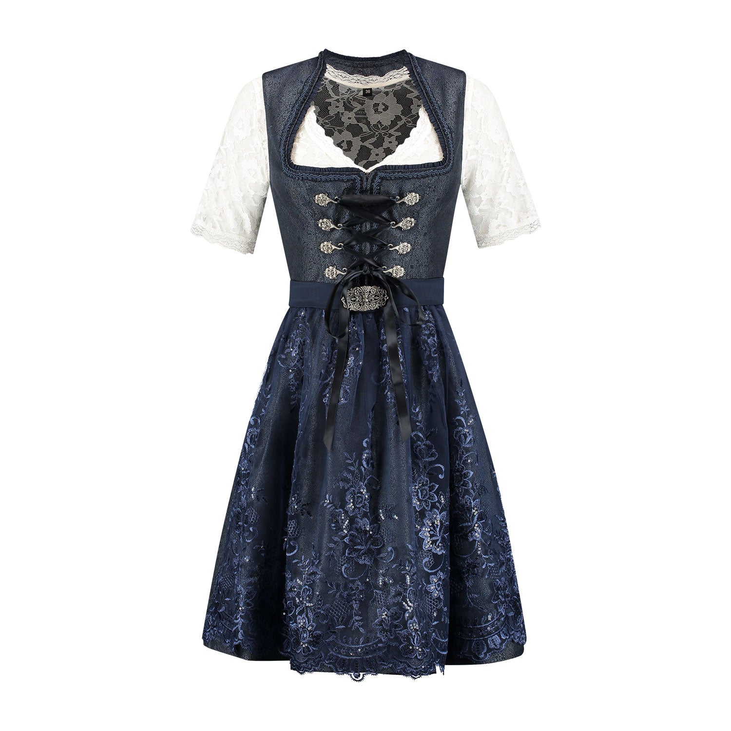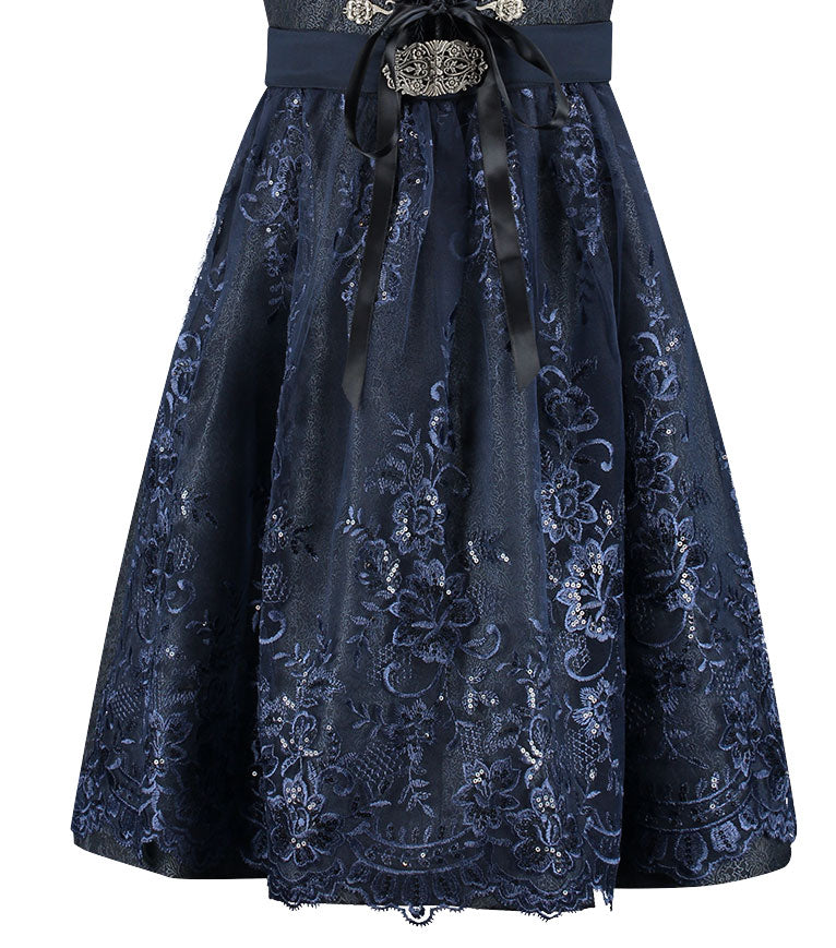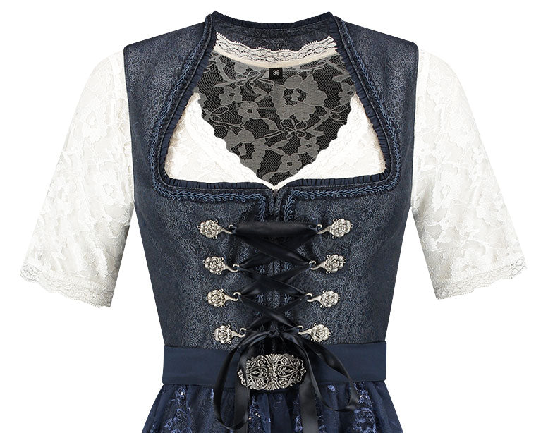 De donkerblauwe jurk vormt een elegante basis, terwijl het verfijnde kantenschort een sierlijk accent toevoegt met zijn transparante structuur en delicaat bloemendessin. Het lijfje is vrouwelijk gesneden en sluit perfect aan, vaak met een decoratieve vetersluiting of haaksluiting die het figuur mooi laat uitkomen. De rijke donkerblauwe kleur maakt deze dirndl zowel feestelijk als tijdloos.
