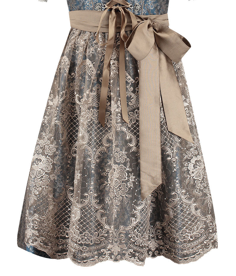 Het lijfje en de rok zijn uitgevoerd in hoogwaardig jacquard, met een verfijnd geweven patroon dat diepte en structuur toevoegt aan het geheel. De diepblauwe basistint wordt stijlvol gecombineerd met warme koffiebruine accenten, wat deze dirndl een unieke en volwassen uitstraling geeft. Het geheel wordt compleet gemaakt door een elegante kantenschort, transparant en met fijn bloemmotief geborduurd.