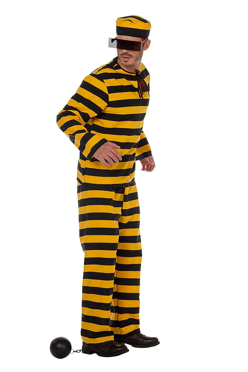 Een mooi boevenpak voor volwassenen in de kleuren geel en zwart gestreept.