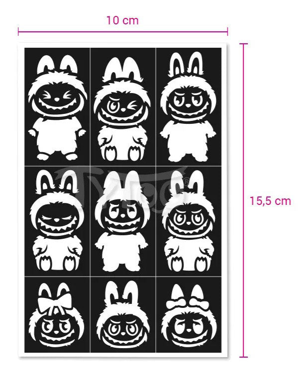 Met deze Glittertattoo Sjablonenset Labubu geef je elk kinderfeest, verkleedpartij of creatieve middag een sprankelend tintje. De set bevat 9 unieke sjablonen met verschillende schattige en speelse Labubu-ontwerpen – perfect om zelf de leukste glittertattoos te maken!