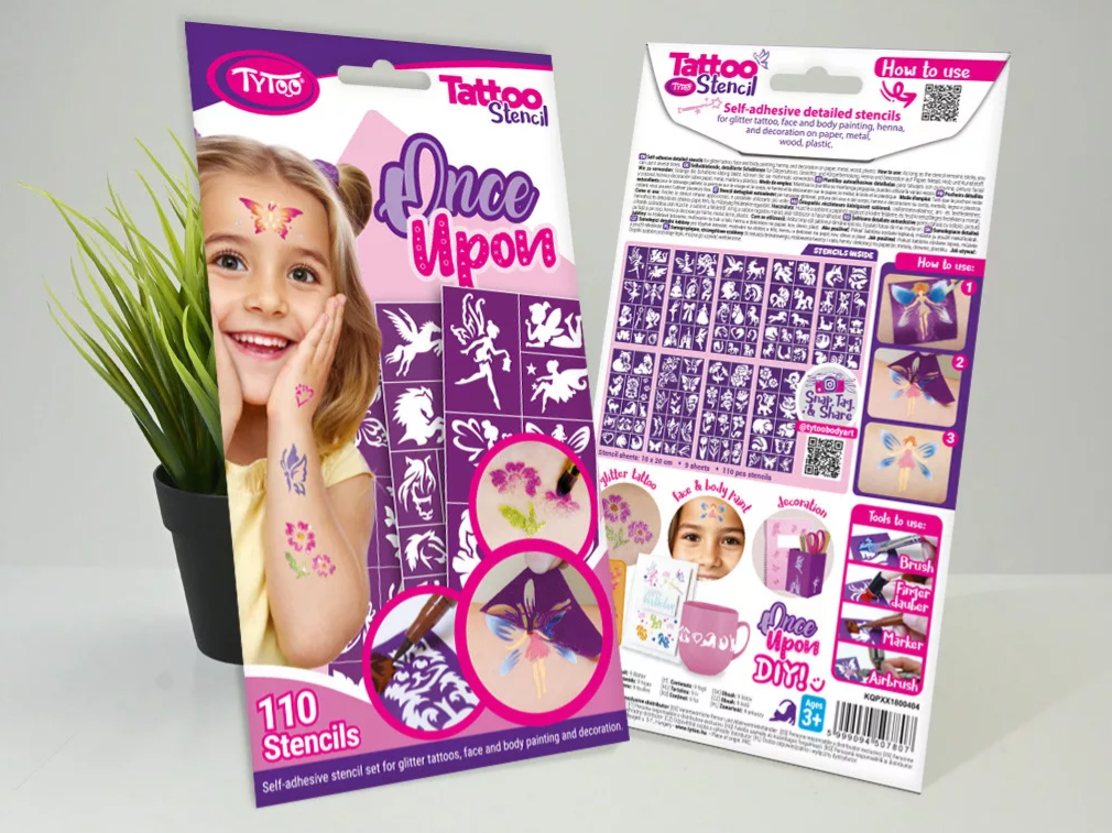 Deze sjablonenset bevat alles wat je nodig hebt voor een echt meisjesachtige glittertattoo: feeën, bloemen, vlinders, pony's en nog veel meer glitterende verrassingen. Jij en de kinderen kunnen samen een magische feeën- en prinsessenwereld schilderen. Het is makkelijk te gebruiken en een plezier om mee te spelen! Gewoon lostrekken, opplakken en het plezier kan beginnen! In de glitterttatoosjablonen set zitten 110 glittertattoo sjablonen. Je maakt een glittertattoo met de speciale huidlijm en fijne glitters.