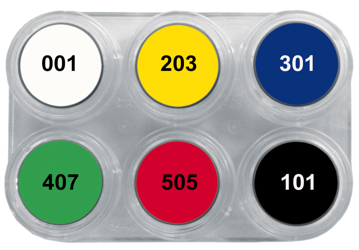 Dit 6 kleuren water make-up palet van Grimas bevat de kleuren 001 Wit, 203 Geel, 301 Blauw, 407 Felgroen, 505 Dieprood en 101 Zwart. Grimas Water Make-up (Pure) is een ongeparfumeerde en glutenvrije schmink, bedoeld voor gezichts- en lichaamsbeschildering. Deze schmink van Grimas werkt net als waterverf. De kleuren zijn onderling mengbaar. Pure betekent dat het betreffende product geen chemische conserveermiddelen (zoals bijvoorbeeld parabenen) of halogeen organische verbindingen bevat. Deze schmink van Grimas mag rondom de ogen en op de slijmvliezen worden gebruikt.