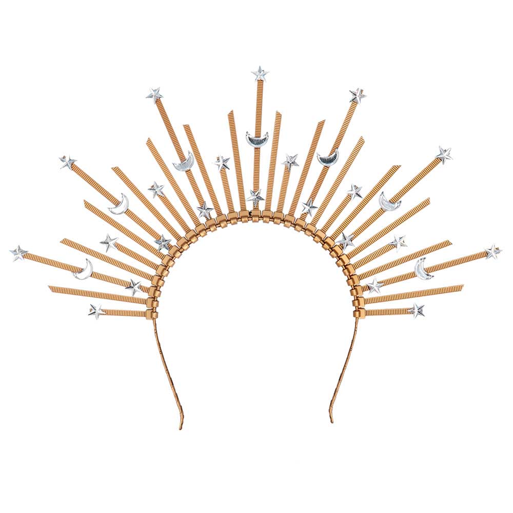 Deze mooie gouden halo kroon diadeem met zilveren halve maantjes en sterren geeft elke outfit een magische Boho uitstraling, maar kan ook zeker een betoverende Carnaval of Cosplay outfit als godin een finishing touch geven.