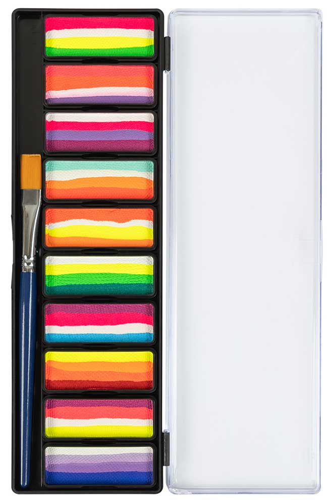 Dit Hobby Watercolor Princess Lines Palette is een splitcake schminkpallet samengesteld door schminkartiest Lyudmyla Kotova. In dit splitcake schmink pallet zitten lange smalle splitcake die perfect zij te gebruiken met een breed schminkpenseel. Deze Neon Paint verkopen wij niet als cosmetica maar als een special fx product.