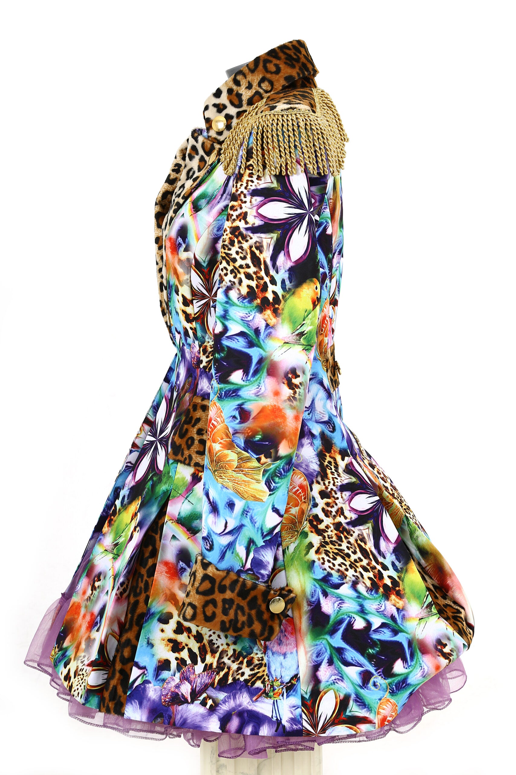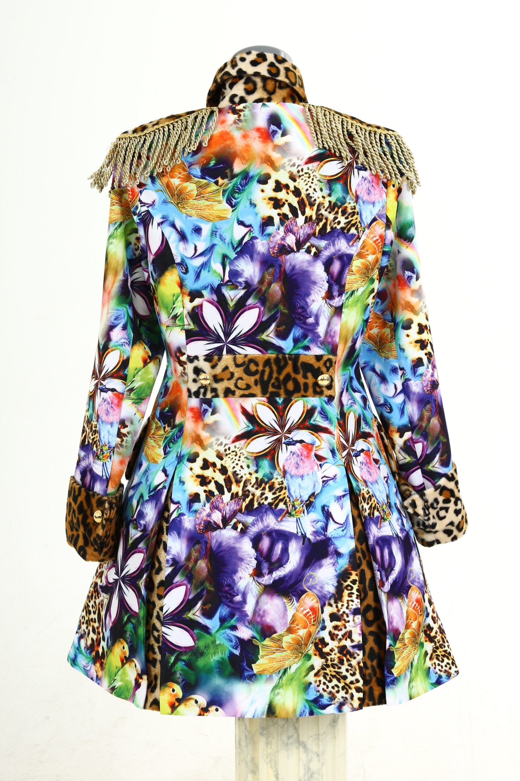 Een mooie carnavalsjas met vogel print en panter accenten. De jas is op de schouders afgewerkt met gouden details.
