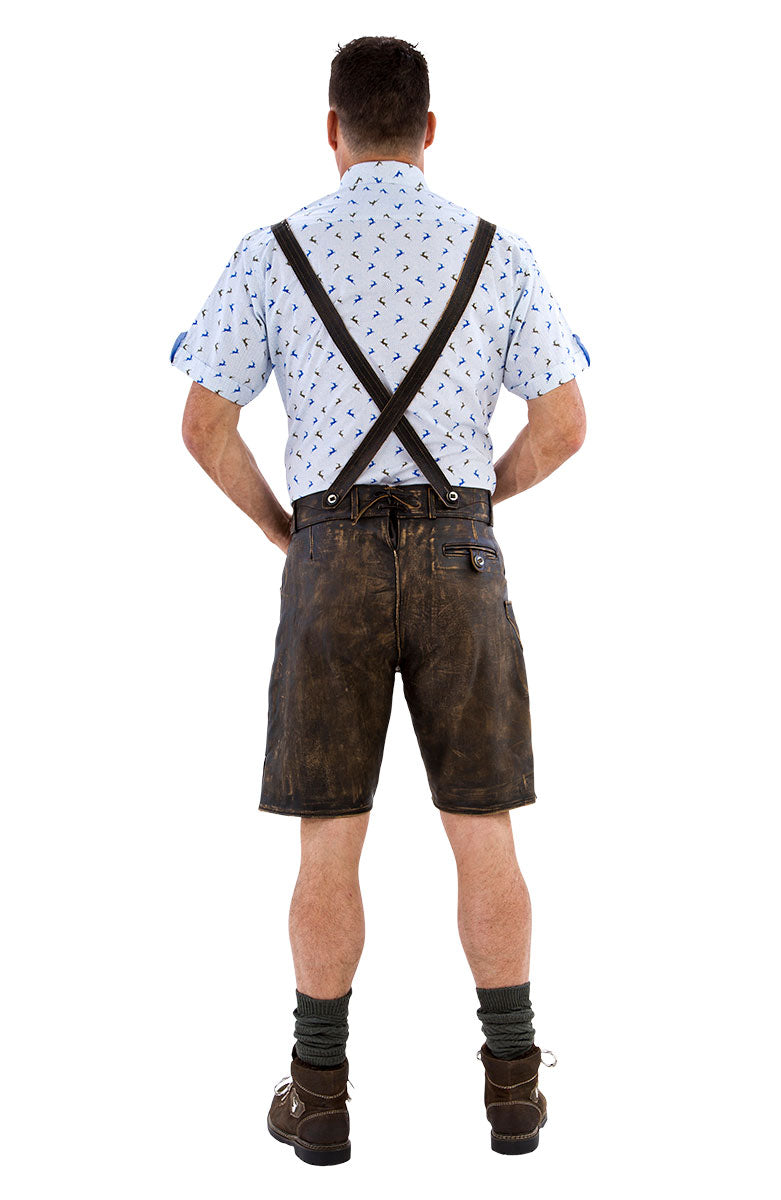 Stoer, authentiek en gemaakt voor mannen met karakter – deze korte bruine lederhose in vintage look van Haus Huberts is een eerbetoon aan traditie met een verweerd randje.