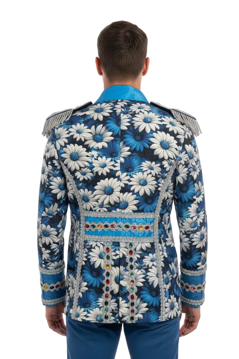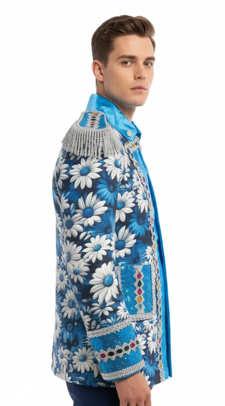 Een mooie Madelief carnavalsjas in het blauw voor heren. De blauwe jas is op de schouders, voor- en achterkant en op de mouwen afgewerkt met prachtige zilveren details.