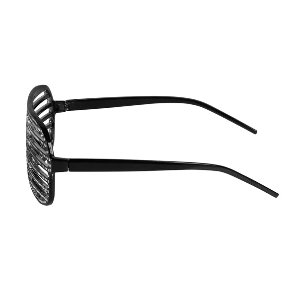 De zwarte lamellenbril is versierd met glittersteentjes perfect om je outfit compleet te maken.