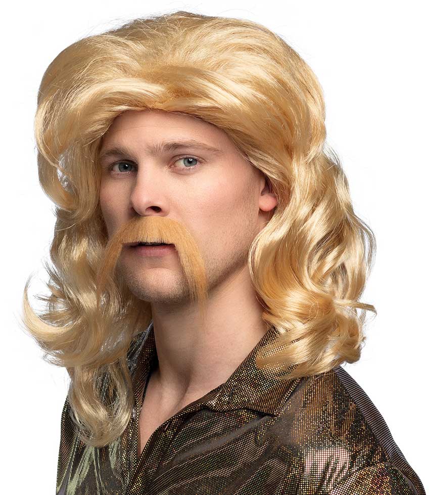 Deze Pruik Barry met snor en half lang blond golvend haar is perfect om je te verkleden met Carnaval of een verkleed feestje.