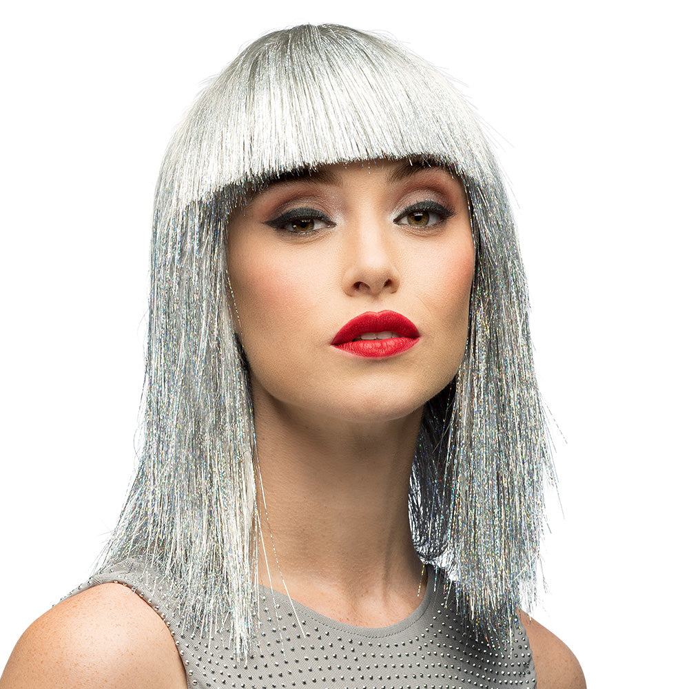 Steel de show met de Pruik Crazy Zilver, een glanzende zilveren glitterpruik! Het perfecte accessoire voor een glamoureuze avond als Oudjaarsavond, een themafeest of carnaval.