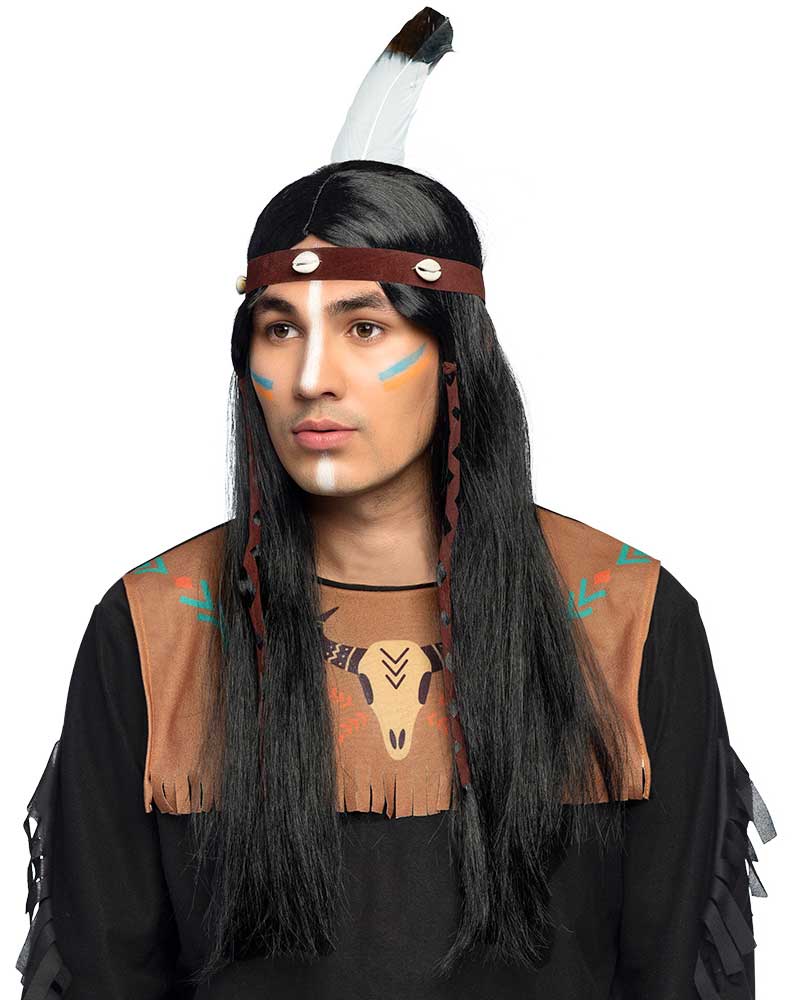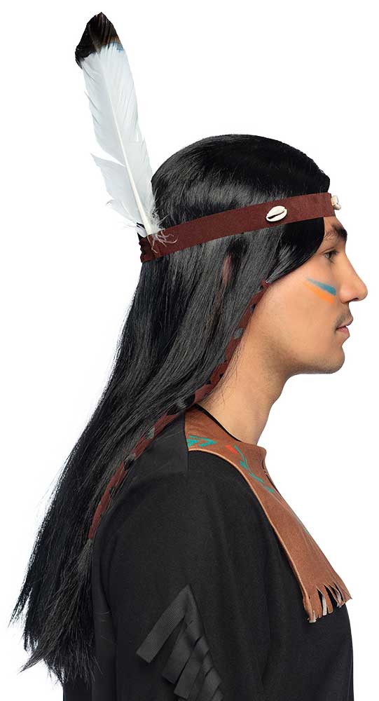 Deze Pruik Takoda is een mooie pruik met haarband en veer, perfect om je te verkleden als Indiaan met Carnaval of een verkleed feestje.