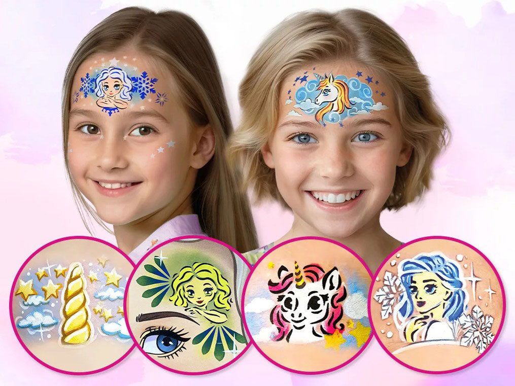 Met heldere kleuren, handige sjablonen, zachte sponsjes, een spuitfles en professionele penselen schilder je eenvoudig magische figuren zoals eenhoorns, hartjes of sterren. Ideaal voor thuis, op kinderfeestjes of verkleedpartijen.