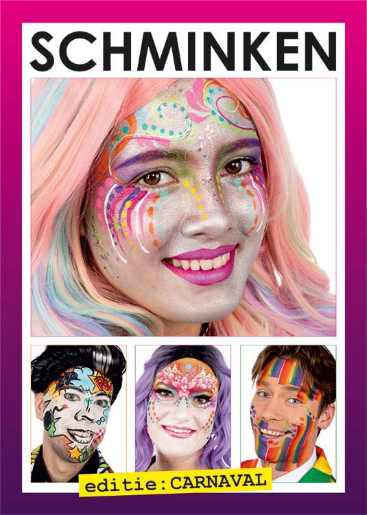 Het Schminken editie: carnaval heeft een soft cover, telt 48 pagina's en heeft een handig A5 formaat van 14,7 x 21 cm. De schminkvoorbeelden in dit boek zijn: Carnavalsontwerp in de Limburgse kleuren rood geel en groen voor mannen en vrouwen. Pompidom, Pop arts ontwerp voor mannen en vrouwen, Bloemenmasker, Beschermengel, Hawai, Neon tijger en tijgerin, Kleuren explosie, Maskerade, Roze masker, Abstracte Karry, Bloemenpracht, Zwart Wit, Hippie voor dames en heren, Glitter girl en Regenboog. Bij alle 20 stap voor stap voorbeelden staan de gebruikte producten en bijpassende pruiken en kostuums beschreven.
