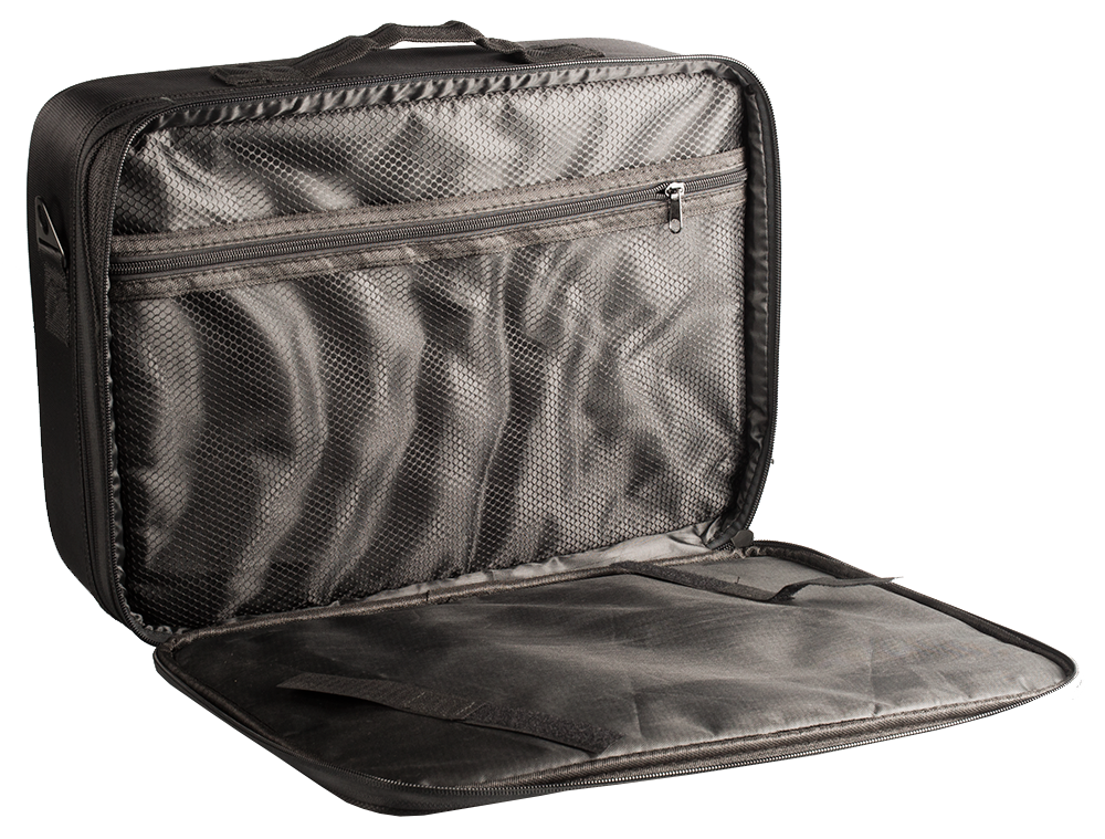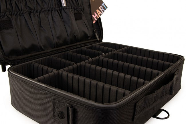 De schminktas is voorzien van een deksel met een dubbele bodem waar je producten in kan schuiven. De binnenzijde is voorzien van een verstelbaar vakkensysteem. Je kan de schminktas volledig naar wens indelen. Op de achterzijde van de schminktas zit een band die je over het handvat van een trolley kunt plaatsen zodat je de tas en trolley tegelijk kan vervoeren.