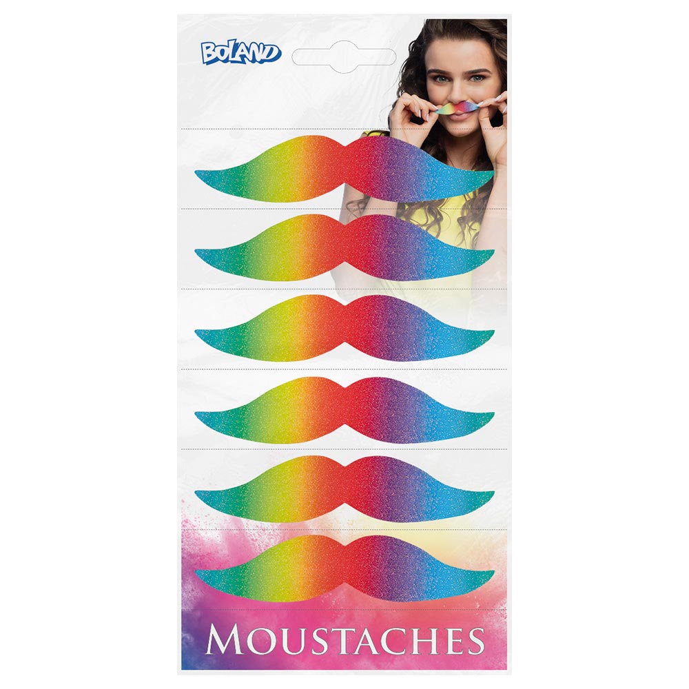 Een vrolijke set van 6 zelfklevende glitter snorren in de kleuren van de regenboog. Erg leuk om een grappige rainbow look te creëren voor Pride. Zeker een aanrader voor een kleurrijke groepsoutfit.