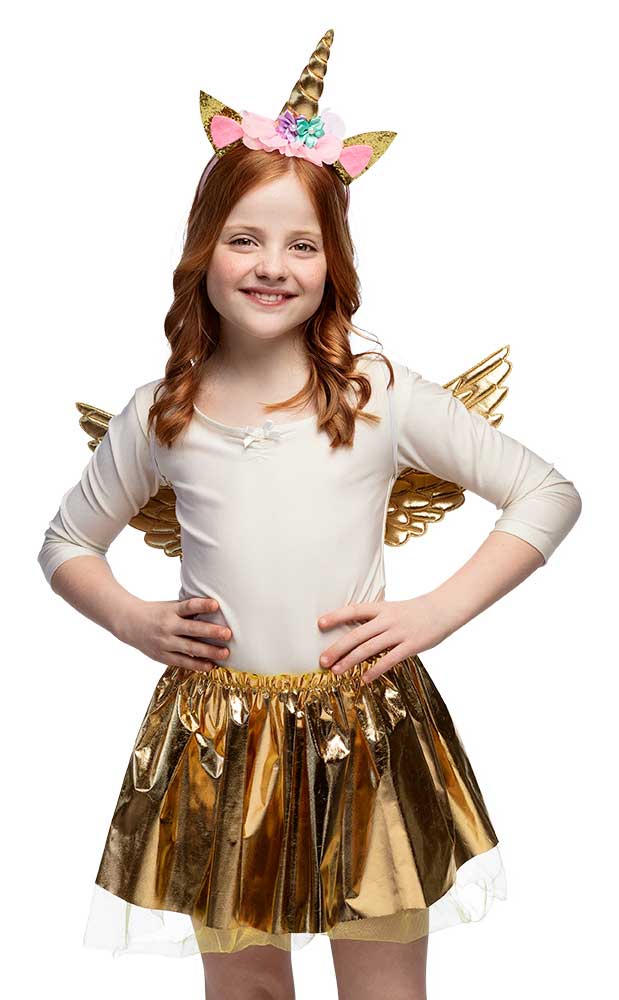 Deze set Eenhoornfee Goud bestaat uit een goudkleurige tiara, vleugels en tutu. Super schattig!