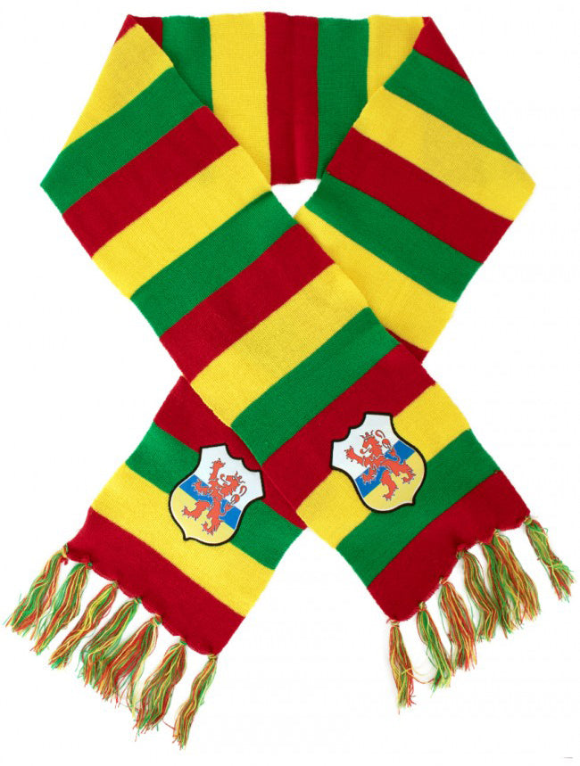 De rood, geel en groene gebreidde sjaal heeft een afmeting van 200 x 20 cm en is voorzien van een logo met de Limburgse Leeuw..