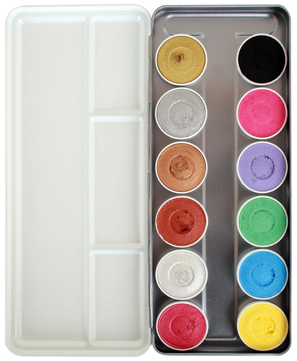 Superstar Schminkpallete Shimmer en Pastel bevat 12 kleuren een zeer gebruiksvriendelijke waterschmink van hoge kwaliteit en voldoet aan alle strenge eisen van de Europese Cosmetica Wetgeving (1223/2009/EG).
