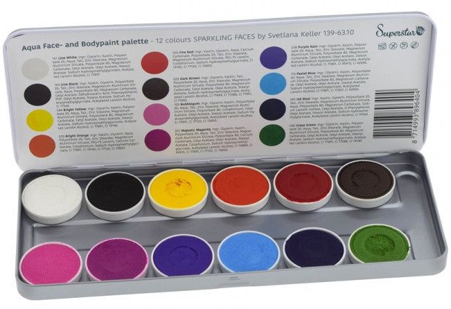 Superstar Schminkpallete Sparkling Faces by Svetlana Keller bevat 12 kleuren een zeer gebruiksvriendelijke waterschmink van hoge kwaliteit en voldoet aan alle strenge eisen van de Europese Cosmetica Wetgeving (1223/2009/EG).