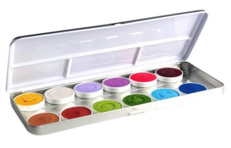 In dit Sprookjes en Dieren schminkpallete zitten de volgende kleuren: Ochre 047, Silver White (Shimmer) 140, Pastel Lilac 037, Light Purple 039, Cerise 040, Plum 127, Bronze (Shimmer) 061, Copper (Shimmer) 058, Light Green 110, Grass Green 042, Pastel Blue 116, Cobalt 114.