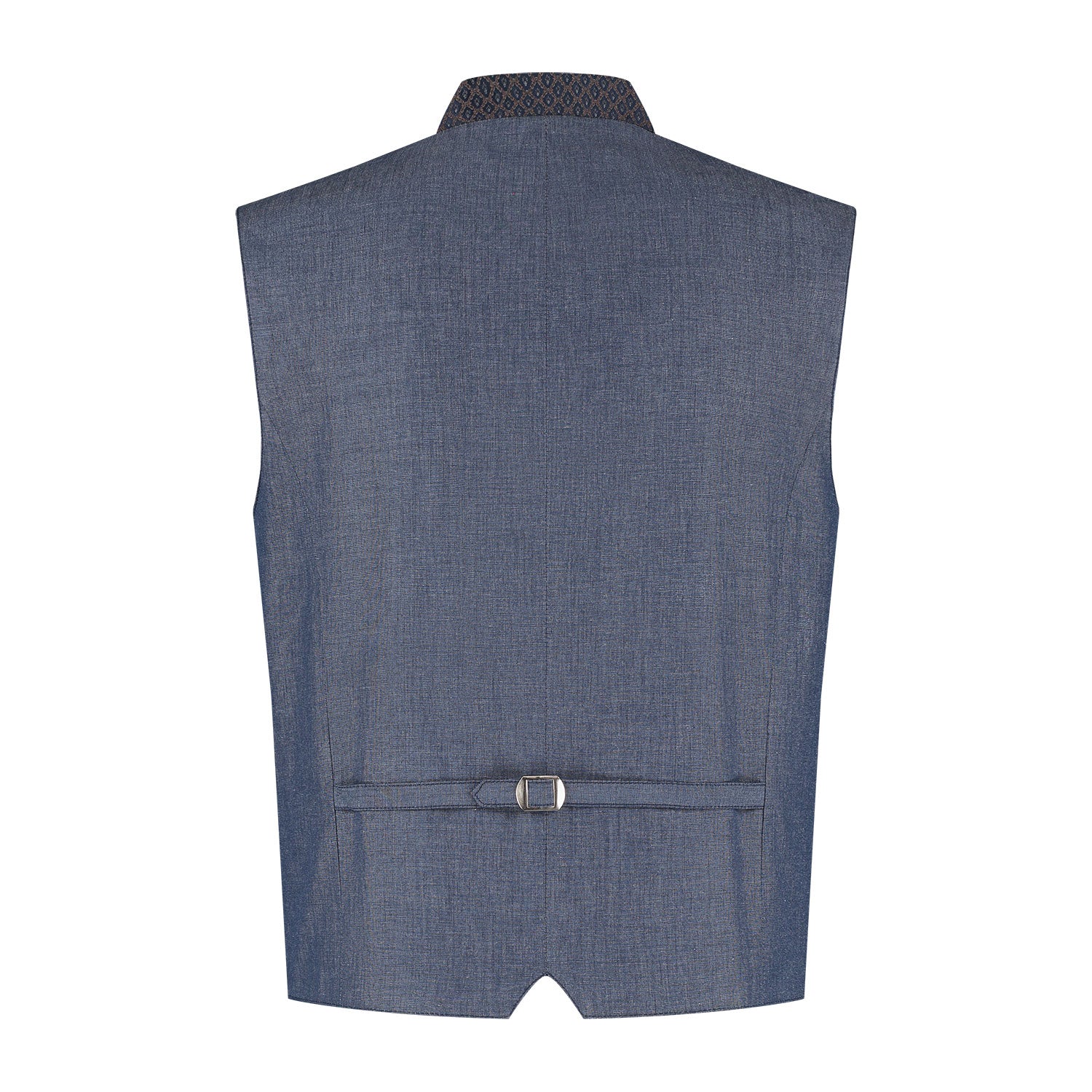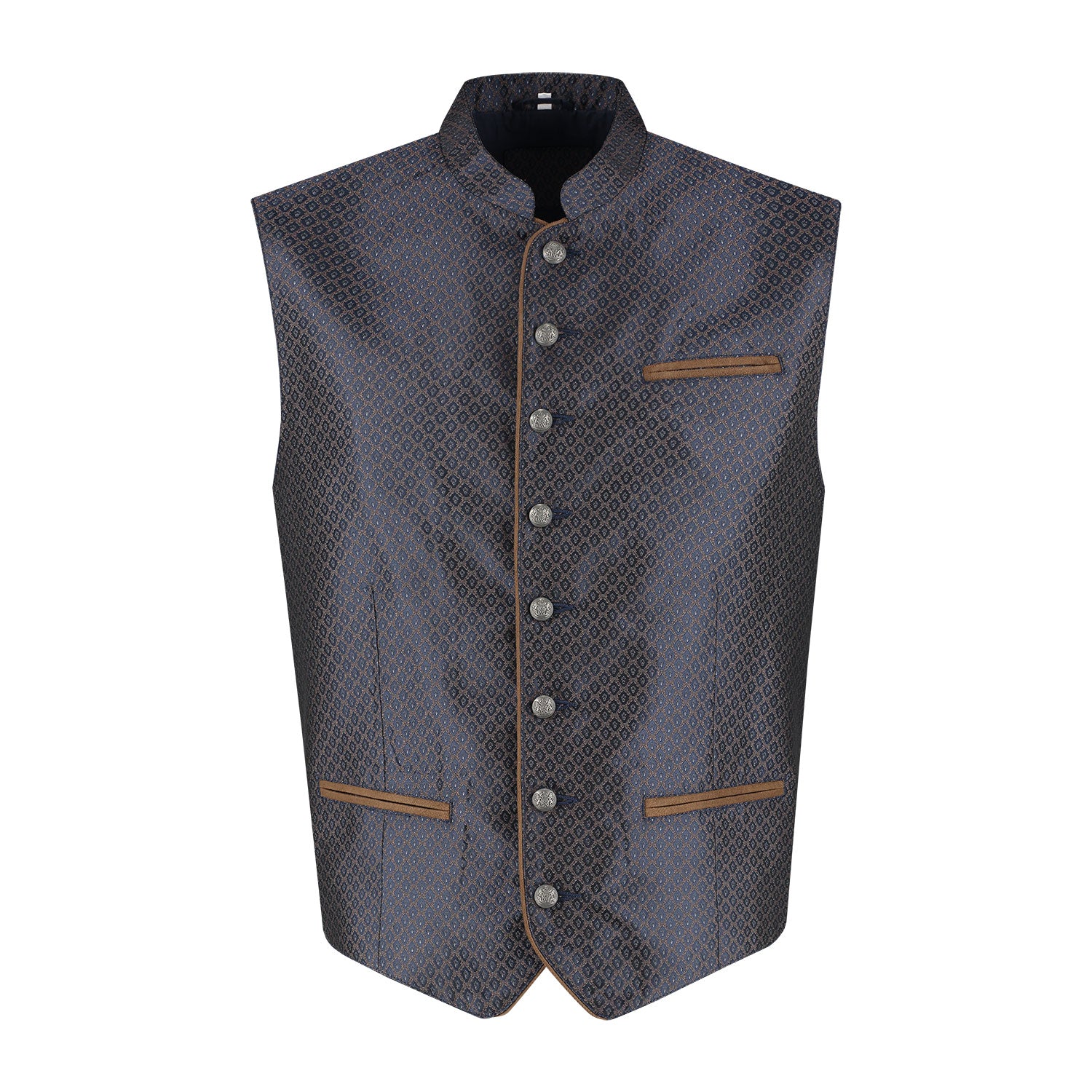 De donkerblauwe basiskleur straalt rust en elegantie uit, terwijl de bruin afgezette randen en knopenlijst zorgen voor een warm kleurcontrast. De gilet heeft een rechte, licht getailleerde snit die het bovenlichaam mooi vormt en zich uitstekend laat combineren met een wit hemd of een ruitvariant met Stehkragen.