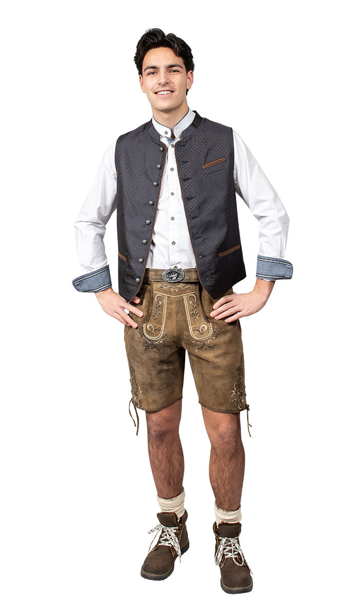 Klassiek, krachtig en verfijnd – deze Trachtenweste in donkerblauw met bruine accenten van Haus Huberts brengt traditionele charme en moderne herenkledij perfect samen.