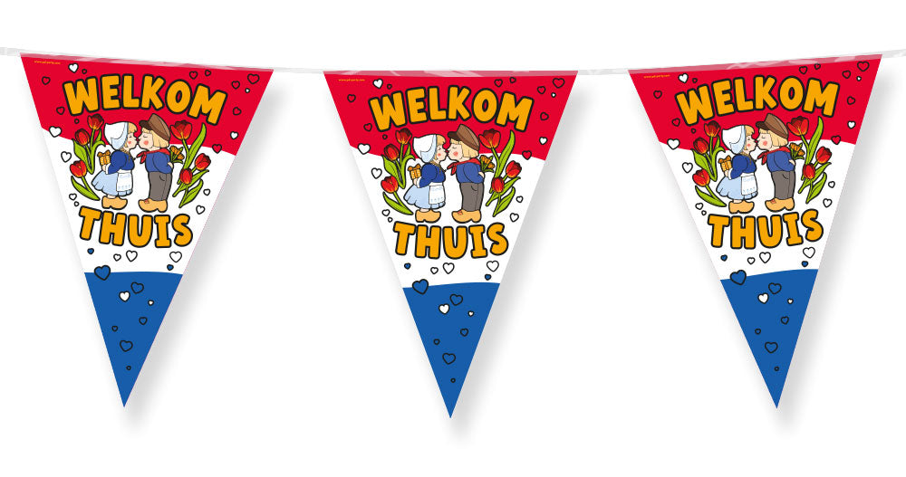 De vlaggetjes zijn gemaakt van folie en de vlaggenlijn Welkom Thuis is 10 meter lang.