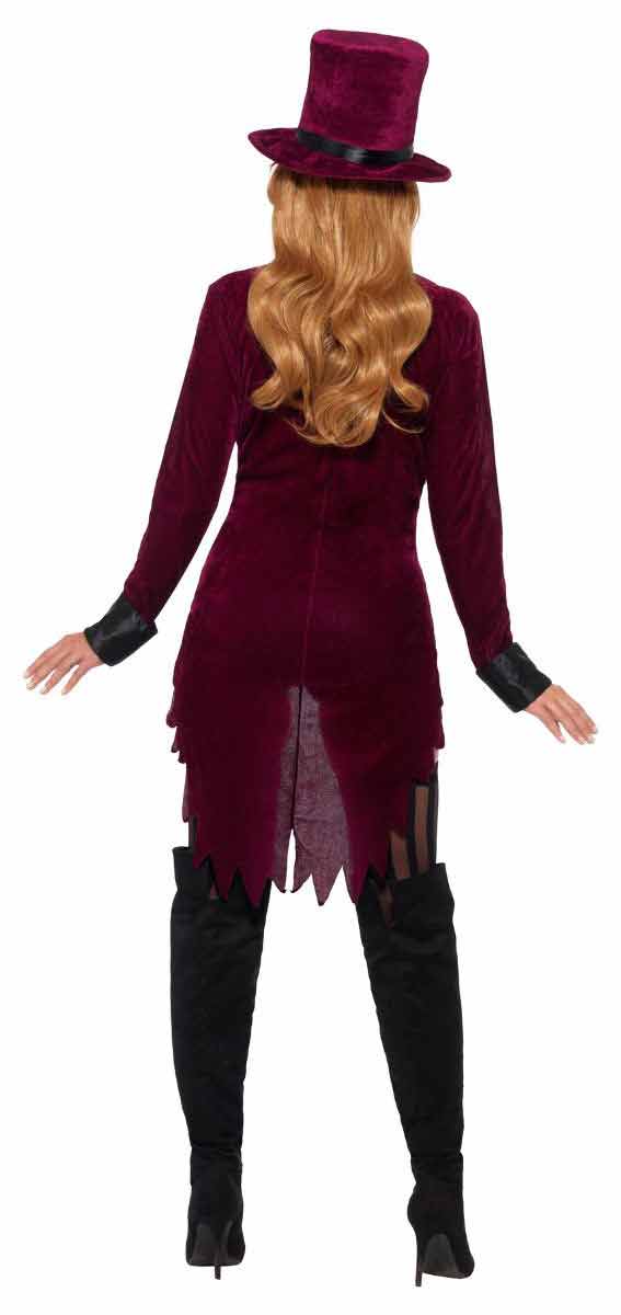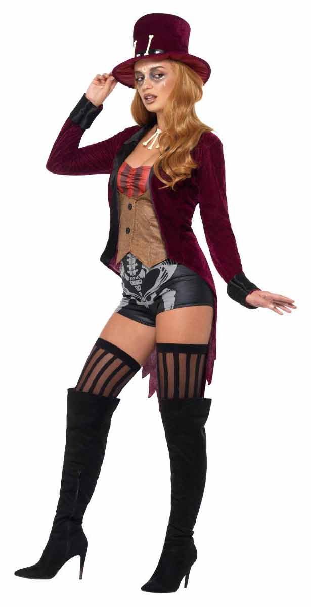 Deze complete set bestaat uit een jas, een top, een korte broek, een hoed en een ketting (stok, kousen en schoenen niet inbegrepen). De slipjas is bordeaix rood van kleur en heeft zwarte zomen, in de top is een beige bruin gilet verwerkt en is gestreept op de borst. De korte short is zwart met een skelet opdruk. De hoed is bordeaux rood en is versierd met kleine botten. De ketting is een zwart touwtje met 3 plastic botten. Het complete voodoo kostuum zal ideaal zijn om te dragen en in op te vallen tijdens Halloween maar ook zeer geschikt voor Carnaval of een foute party!